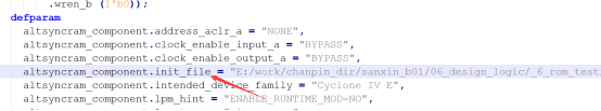 将altsyncram.component.init_file=“”,双引号中的文件前面的路径修改从盘符开始的路径。切记:路径的下一级标识为“/”。