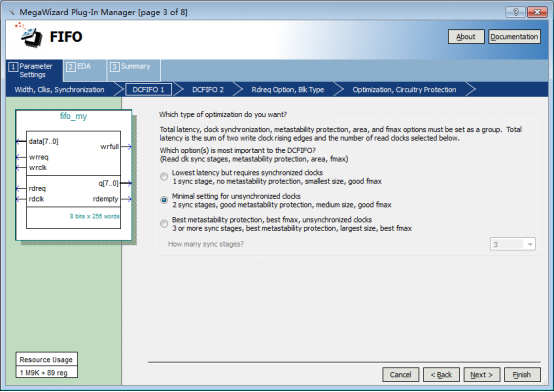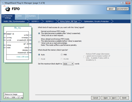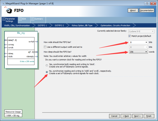 选择深度为256,宽度为8,选择独立的读写时钟。点击Next。