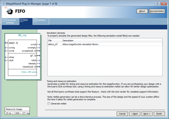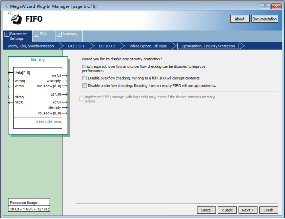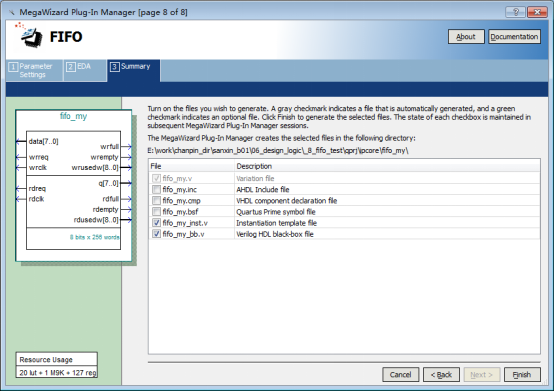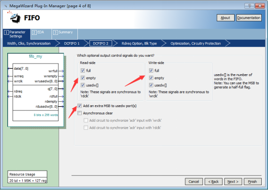 将所有的读写标志信号线全部选中,并且在usedw最前面加上一位。默认当fifo的深度为256时,usedw的宽度为8,当fifo满了时,usedw的值为0。当添加上一位后,fifo满时,usedw的值为256。点击Next。