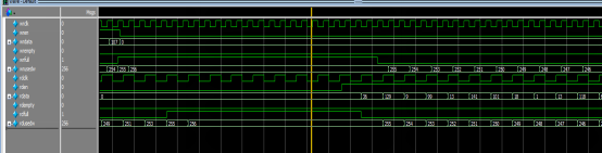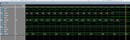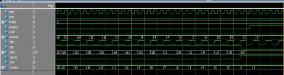 读数据时,输出数据和输入的数据是相同的。延迟一拍后,数据输出并且rdfull拉低,再延迟一拍后,统计量输出。此时写一侧的信号也会有变化,但是会有略微延迟。