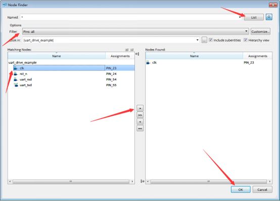在本设计中,所有的信号都是由外部的clk信号进行驱动的,所以此采样时钟,选择为clk。点击clock对话框后面的三个点。将filter选择为pin:all,点击list,在matching nodes中选择clk,点击“大于”,在nodes found中出现clk,然后点击ok。