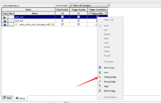 在uart_rxd的trigger conditions的位置,右击,选择falling edge。