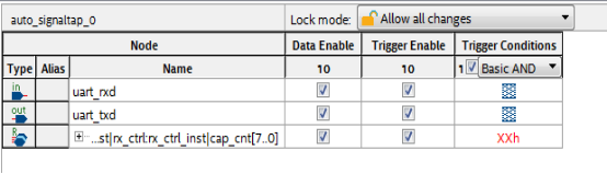 uart_txd和uart_rxd为端口信号,选择filter时,选择PIN:all即可,cap_cnt为内部信号,选择filter时,选择signal tap :pre-synthesis。