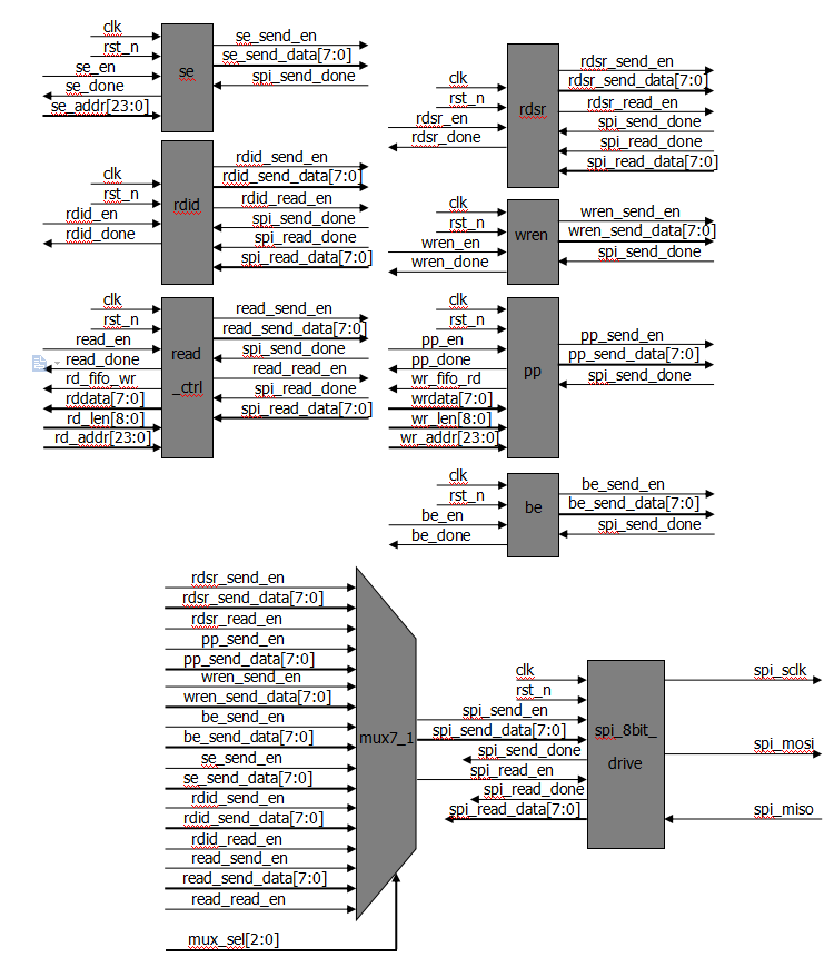 设计中,各个命令单独写出控制器,通过多路选择器选择出对应的命令,然后控制spi_8bit_drive将数据按照spi的协议发送出去。各个命令的脉冲通过ctrl模块进行控制各个命令控制器,写入的数据首先写入到写缓冲区,读出的数据读出后写入到读缓冲区。