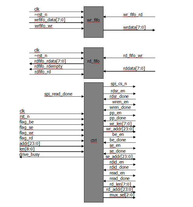 该模块负责将外部写fifo中的数据写入到flash中。wr_fifo_rd为写fifo的读使能信号,wrdata为从写fifo中读出的数据,wr_len为需要写入flash中数据的长度,wr_addr为写入地址。