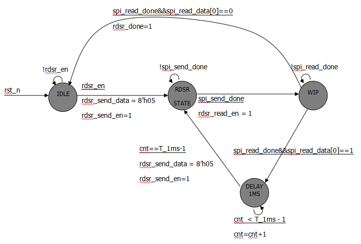 本模块采用状态机设计实现。ILDE(发送读状态寄存器命令)、RDSRSTATE(发送读使能)、WIP(判断wip位)、 DELAY1ms(延迟1ms)。cnt为延迟1ms的计数器。
