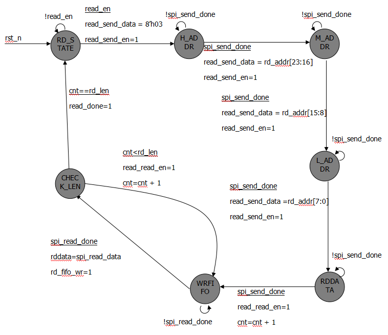 该模块采用状态机实现。RD_STATE(等待读命令)、H_ADDR(发送高八位地址)、M_ADDR(发送中间八位地址)、L_ADDR(发送低八位地址)、RDDATA(读取数据)、WRFIFO(将读出的数据写入到FIFO中)、CHECK_LEN(判断读取的长度)。