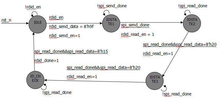 该模块采用状态机的方式实现。IDLE(等待读取ID的命令)、IDSTATE1(读取高八位ID)、IDSTATE2(读取中间八位ID)、IDSTATE3(读取低八位ID)、ID_CHECK(检测ID的正确性)。
