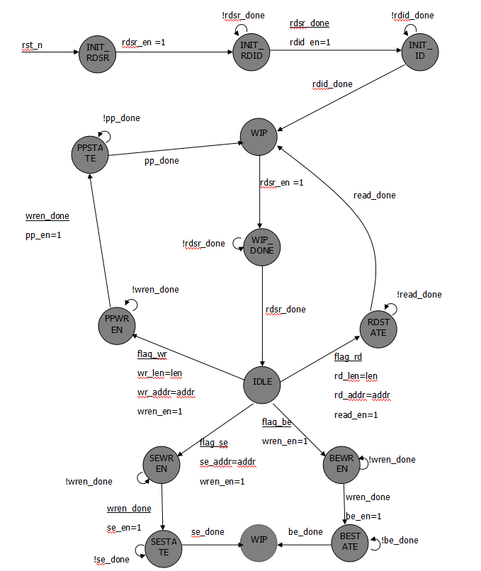 该模块采用状态机实现。INIT_RDSR(读WIP),INIT_RDID(读ID),INIT_ID(判断ID),WIP(读WIP),WIP_DONE(等待WIP),IDLE(空闲状态),**STATE(执行对应的命令),**WREN(打开flash的写使能)。在进行任何命令前,都检查wip。
