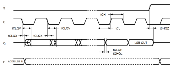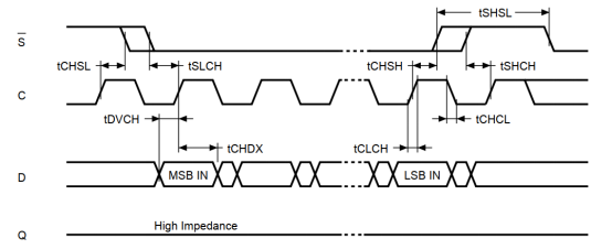 C(serial clock:串行时钟)为D和Q提供了数据输入或者输出的时序。D的数据总是在C的上升沿被采样。Q的数据 在C的下降沿被输出。
