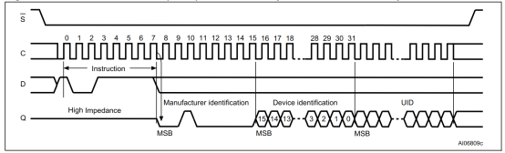 RDID(Read Identification :读ID):发送命令RDID(9F),然后接收第1个字节的memory type(20H),第二个字节的memory capacity(15H)。后续的字节暂不关心。