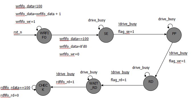 此模块采用状态机实现。WRFIFO(将1至100写入wrfifo中)、SE(扇区擦除)、PP(写入flash)、RD(读出flash)、WAIT_RD(等待读取)、CHECK( 检测读出的数据的正确性)。