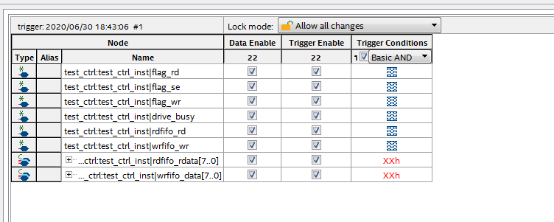 将rdfifo_rd的触发条件设置为上升沿(将wrfifo_wr触发条件修改为donot care)。点击触发后,按下复位按键。