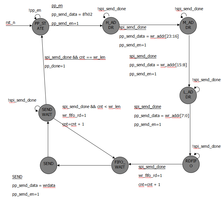 该模块采用状态机实现。PP_STATE(发送pp命令),H_ADDR(发送高八位地址)、M_ADDR(发送中间八位地址),L_ADDR(发送低八位地址)、RDFIFO(读写fifo)、FIFO_WAIT(等待读写fifo的数据输出)、SEND(发送8bit数据)、SEND_WAIT(发送等待,发送完成后判断是否发送完成)。对于所有的脉冲信号,没有赋值的位置,全部赋值为0。