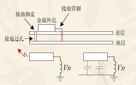 对于金属外壳接地的元件,应在其投影区的顶层敷上接地铜皮,通过金属外壳和接地铜皮间的分布电容来抑制对外辐射与提高抗扰度。