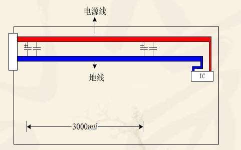 如果电源走线过长,应每隔3000mil对地加去耦电容,电容取值为10uF+1000pF,可以滤除电源线的噪声。