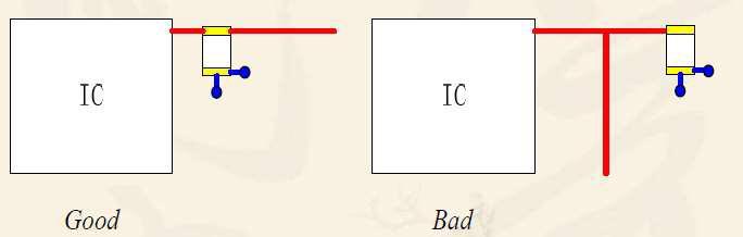 之前有讲过,滤波电容的应先经过滤波电容,再到器件管脚,使电源电流先经过滤波电容再给IC供电,并且IC反馈给电源的噪声也会被该滤波电容先滤掉,保证了电源的干净。