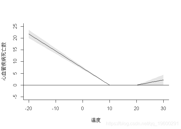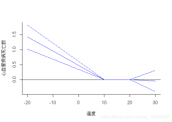 第一个结果表明,在给定的一天中,-20°C的温度会在五天后导致0.95例心血管死亡的增加,或者在给定的一天中,温度为-6摄氏度时,心血管死亡的数目增加0.95。其他类型的预测可以通过crosspred()获得。特别是,如果模型链接等于log或logit,则将自动返回取幂的预测。如果参数cum设置为TRUE,则是累积预测的矩阵cum。