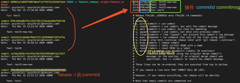 如上图标注的,传的 commitid 为你想修改的提交的 前一个 commitid。执行命令后进入 vi 模式,会提示你一些操作命令(p、r、e...)你只需要在最上方修改默认的 pick 为你想要的操作,然后退出并 wq 保存即可生效。