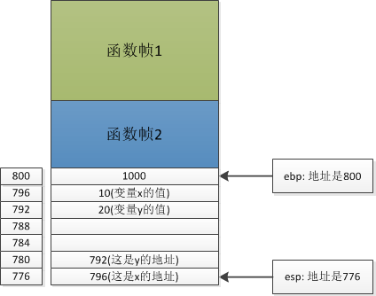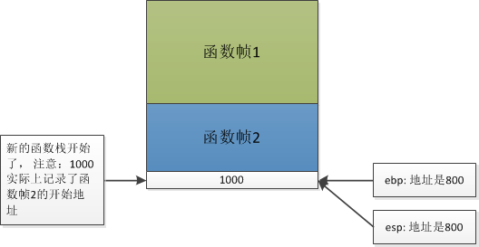 “把esp的值赋给ebp”你看看,是不是新的函数帧生成了?只不过现在只有一行数据。ebp和esp指向同一地址。函数帧的第一行的地址是800,里边的内容是1000,也就是上个函数帧的地址。