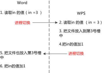 WPS接着干活,他把文件放到了第3号槽里,并且把in 改为4,然后离开了。接下来又轮到Word运行了,它发现free_slot 为3,就把文件也放到了第3号槽里,把free_slot 加1,得到4,存入in 中。可怜的WPS,他的文件被覆盖掉了。