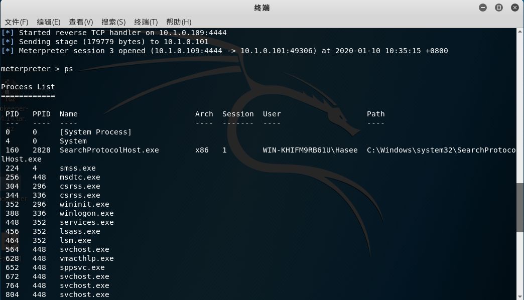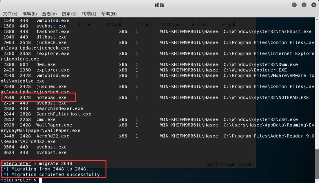在目标打开PDF文件时,会产生卡壳无法正常打开,当软件关闭,meterpreter也将会断开。使用migrate命令将进程迁移至其他进程上,保持连接状态。