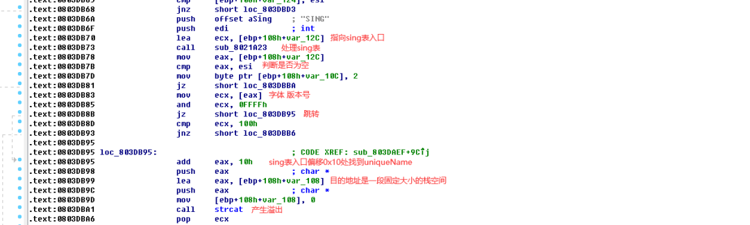 在CoolType.dll中,使用strcat操作此处时并没有判断长度,所以构造超长的uniqueName可导致栈溢出。