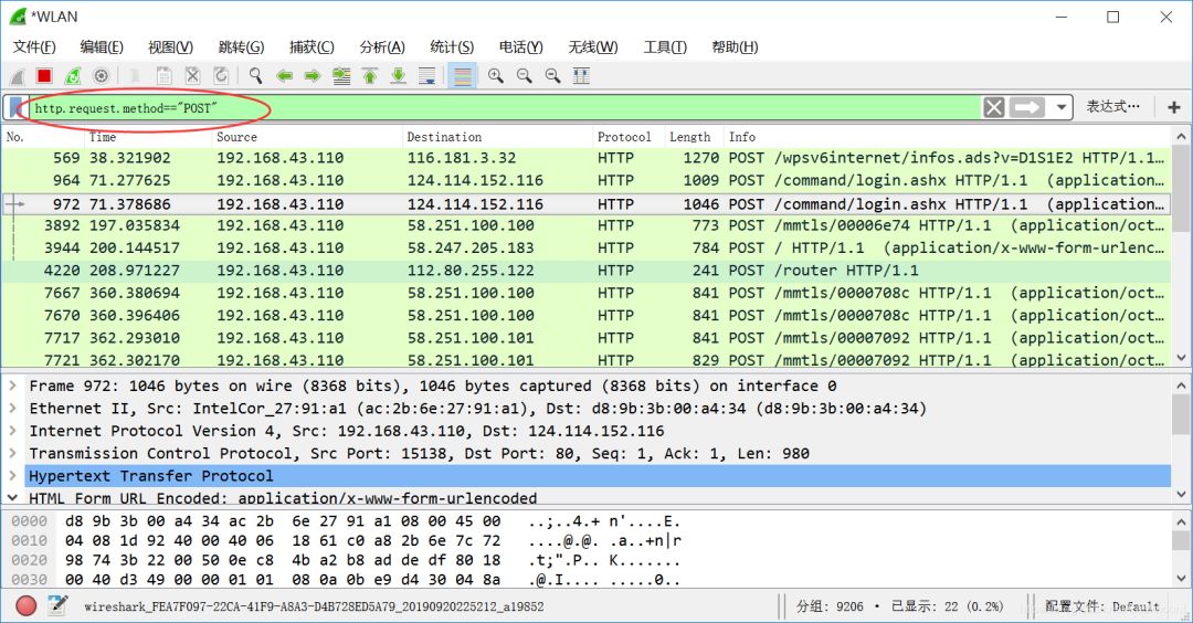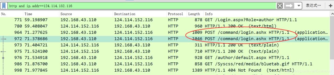 http.request.method==“POST” and http and ip.addr==124.114.152.116
