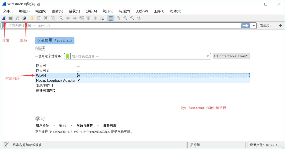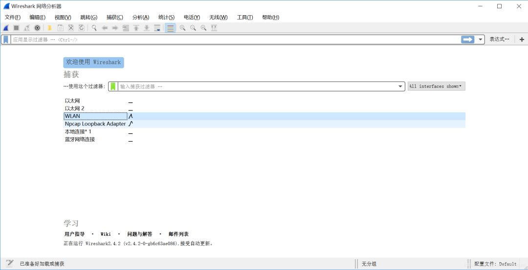 下面通过一个简单的示例讲解Wireshark抓包的基本用法,运行软件如下图所示。