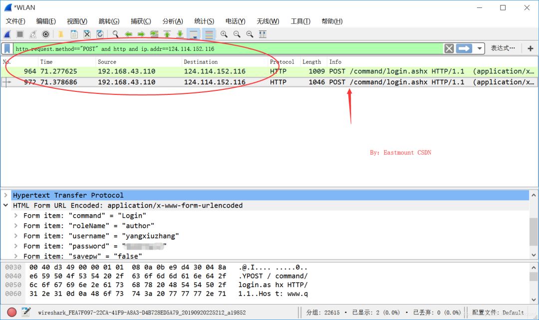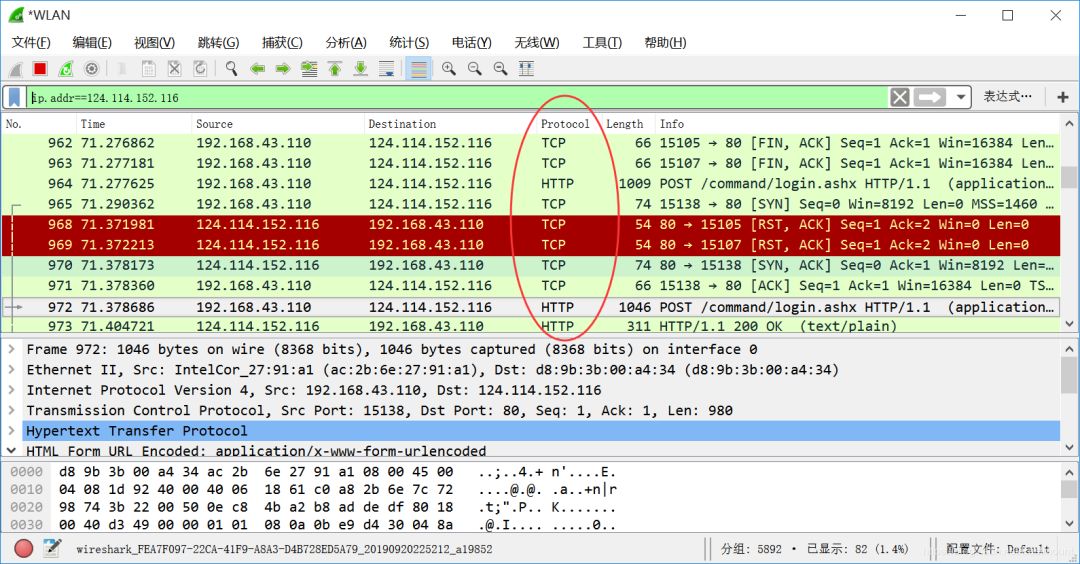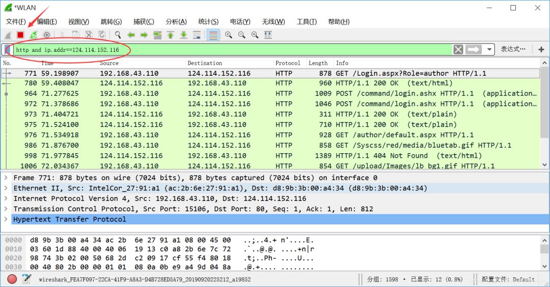 第五步:登录成功之后停止抓包,并使用下面的过滤器获取HTTP协议且与该IP地址相关的信息。
