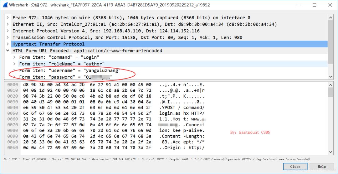 第七步:点击该POST且包含login的登录页面,点击最后一行“HTML Form URL Encoded:application/x-www-form-urlencoded”,获取如下图所示的用户名和密码。如果密码被MD5加密,可以寻找在线网站进行解密。