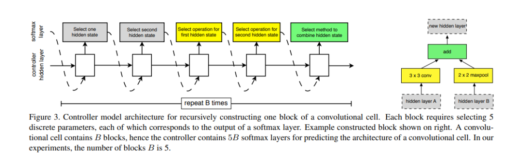 神经网络结构搜索中,该控制器用于生成神经网络的结构超参数。在下图中,控制器用于生成一个卷积神经网络。控制器预测滤波器高度、滤波器宽度和步长。预测由 softmax 分类器执行,然后作为输入,输入到下一个时间步。一旦控制器完成了生成结构的过程,带有这个结构的神经网络就会建立起来,并用它进行训练。