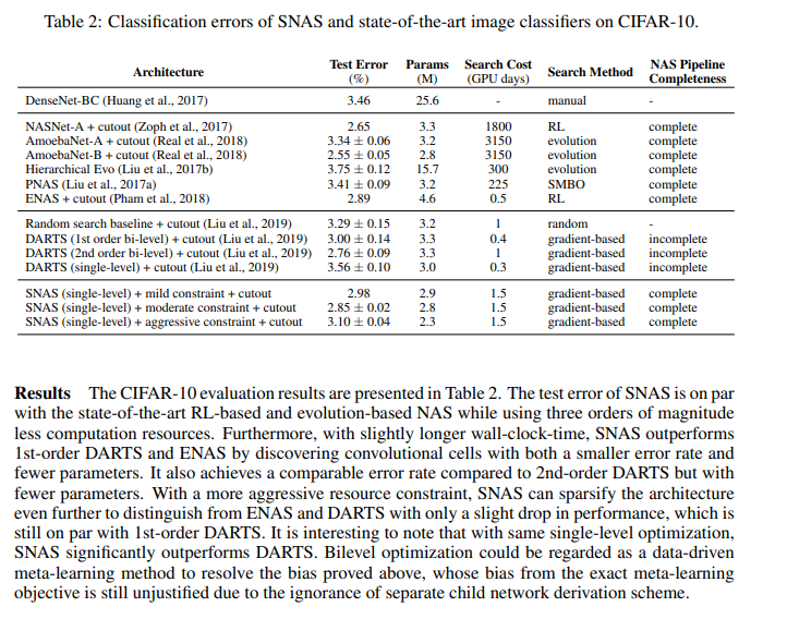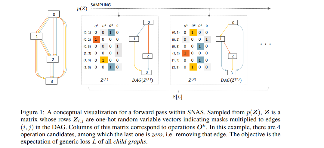 这篇论文的作者提出了随机神经结构搜索 (SNAS)。SNAS 是 NAS 的端到端解决方案,在同一轮的反向传播中同时训练神经算子参数和体系结构分布参数。在此过程中,它维护了 NAS 流程的完整性和可微性。