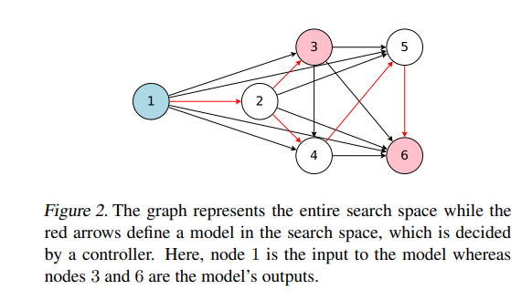 本文作者提出了一种称为高效神经结构搜索 (ENAS) 的方法。在这种方法中,控制器通过在大型计算图中搜索最优子图来发现神经网络结构。该控制器经过训练,可以选出在验证集上获得最佳准确度的子图。