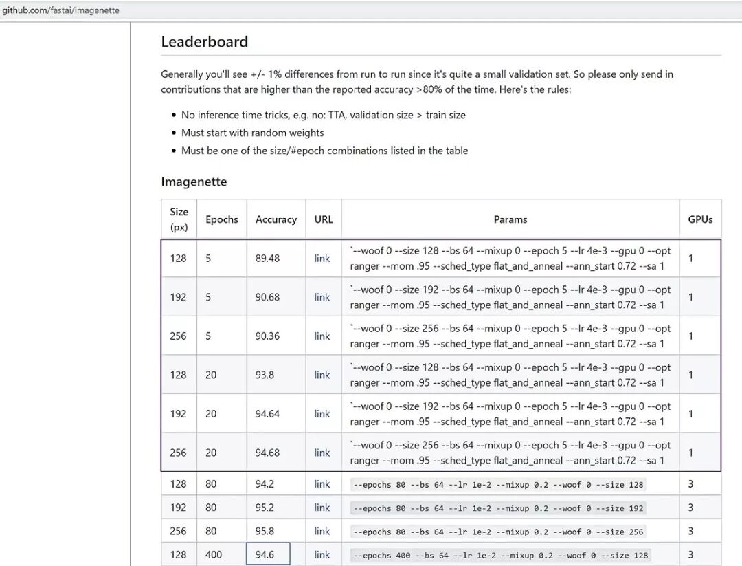 3 、我们与Ranger和Mish (MXResNet的一部分)一起的FastAI的记录:https://github.com/lessw2020/Ranger-Mish-ImageWoof-5