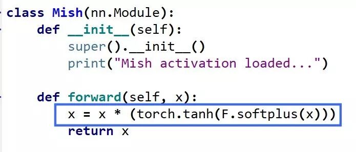 直接看Mesh的代码会更简单一点,简单总结一下,Mish=x * tanh(ln(1+e^x))。