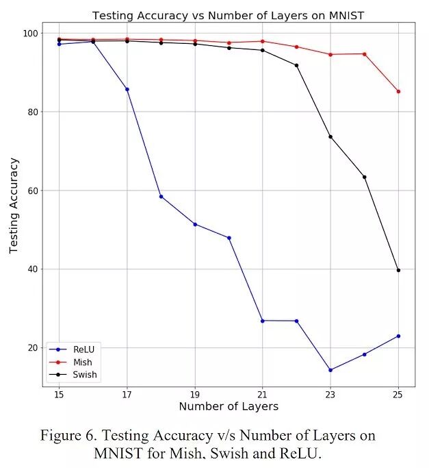 这种通过Mish激活曲线平滑性来推送信息的能力如下图所示,在本文的一个简单测试中,越来越多的层被添加到一个测试神经网络中,而没有一个统一的函数。随着层深的增加,ReLU精度迅速下降,其次是Swish。相比之下,Mish能更好地保持准确性,这可能是因为它能更好地传播信息: