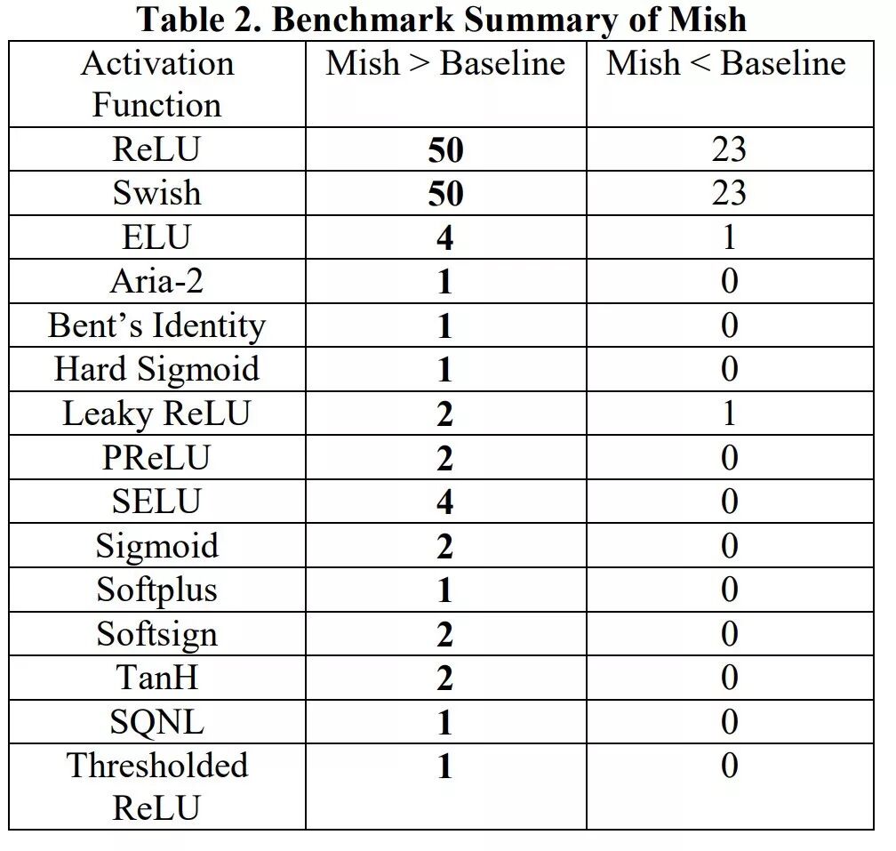 我发现Mish在训练稳定性、平均准确率(1-2.8%)、峰值准确率(1.2% - 3.6%)等方面都有了全面的提高,与本文的结果相匹配或超过。