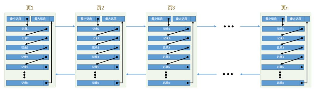这个过程表明了在对页中的记录进行增删改操作的过程中,我们必须通过一些诸如记录移动的操作来始终保证这个状态一直成立:下一个数据页的主键值必须大于上一个页中的主键值。