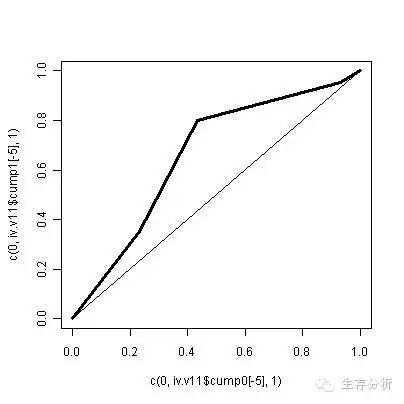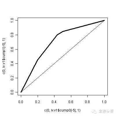 就以上面这个表格为例,其中的cump1和cump0,从某种角度看就是我们做ROC曲线时候的TPR与FPR。例如,此时的评分排序为A12,A11,A14,A13,若以A14为cutoff,则此时的TPR=cumsum(p1)[3]/(sum(p1)),FPR=cumsum(p0)[3]/(sum(p0)),就是cump1[3]和cump0[3]。于是我们可以画出相应的ROC曲线。