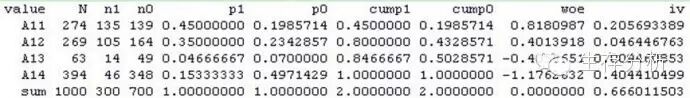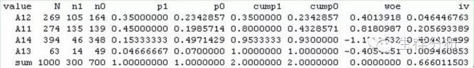 数据来自于著名的German credit dataset,取了其中一个自变量来说明问题。第一列是自变量的取值,N表示对应每个取值的样本数,n1和n0分别表示了违约样本数与正常样本数,p1和p0分别表示了违约样本与正常样本占各自总体的比例,cump1和cump0分别表示了p1和p0的累计和,woe是对应自变量每个取值的WOE(ln(p1/p0)),iv是woe*(p1-p0)。对iv求和(可以看成是对WOE的加权求和),就得到IV(information value信息值),是衡量自变量对目标变量影响的指标之一(类似于gini,entropy那些),此处是0.666,貌似有点太大了,囧。