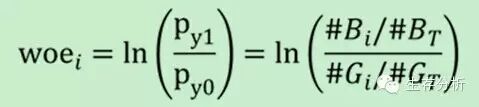 表中以age年龄为某个自变量,由于年龄是连续型自变量,需要对其进行离散化处理,假设离散化分为5组(至于如何分组,会在以后专题中解释),#bad和#good表示在这五组中违约用户和正常用户的数量分布,最后一列是woe值的计算,通过后面变化之后的公式可以看出,woe反映的是在自变量每个分组下违约用户对正常用户占比和总体中违约用户对正常用户占比之间的差异;从而可以直观的认为woe蕴含了自变量取值对于目标变量(违约概率)的影响。再加上woe计算形式与logistic回归中目标变量的logistic转换(logist_p=ln(p/1-p))如此相似,因而可以将自变量woe值替代原先的自变量值;
