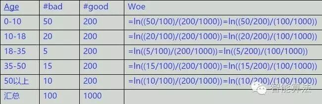 表中以age年龄为某个自变量,由于年龄是连续型自变量,需要对其进行离散化处理,假设离散化分为5组,#bad和#good表示在这五组中违约用户和正常用户的数量分布,最后一列是woe值的计算,通过后面变化之后的公式可以看出,woe反映的是在自变量每个分组下违约用户对正常用户占比和总体中违约用户对正常用户占比之间的差异;从而可以直观的认为woe蕴含了自变量取值对于目标变量(违约概率)的影响。再加上woe计算形式与logistic回归中目标变量的logistic转换(logist_p=ln(p/1-p))如此相似,因而可以将自变量woe值替代原先的自变量值;