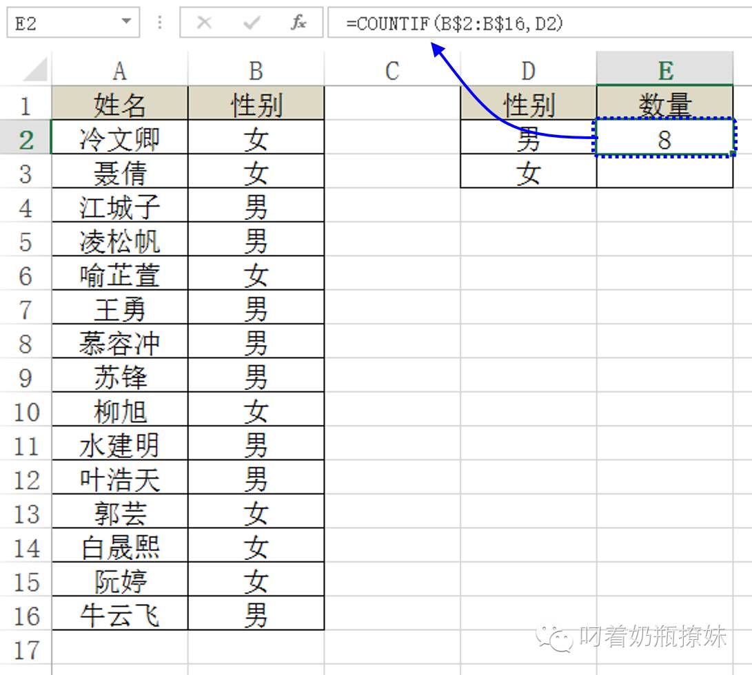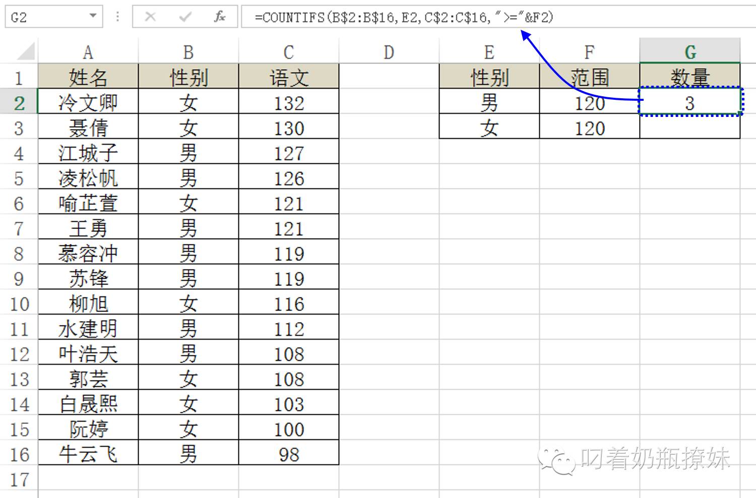 =COUNTIFS(B$2:B$16,E2,C$2:C$16,">="&F2)