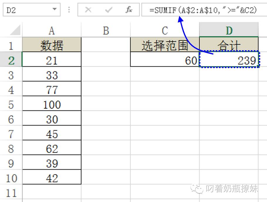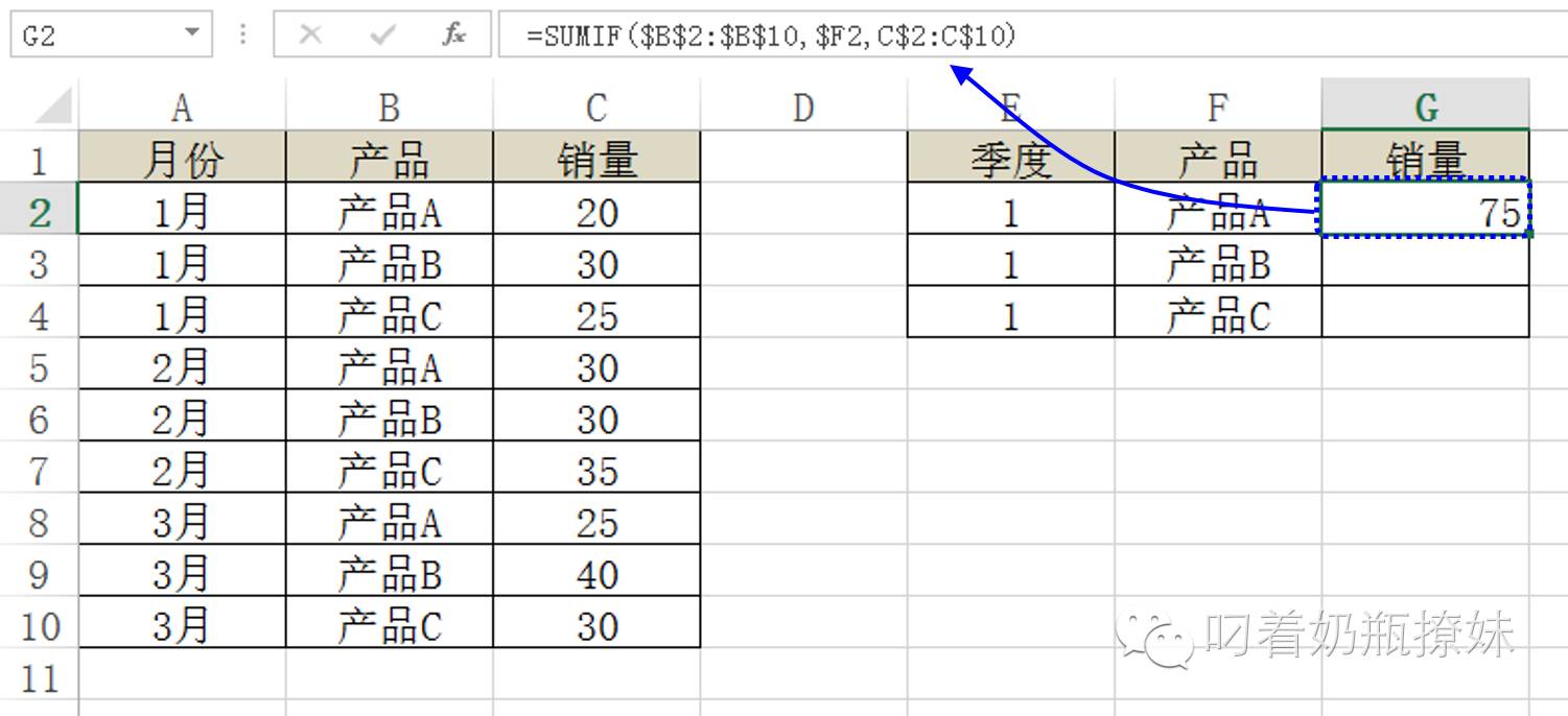 =SUMIF($B$2:$B$10,$F2,C$2:C$10)