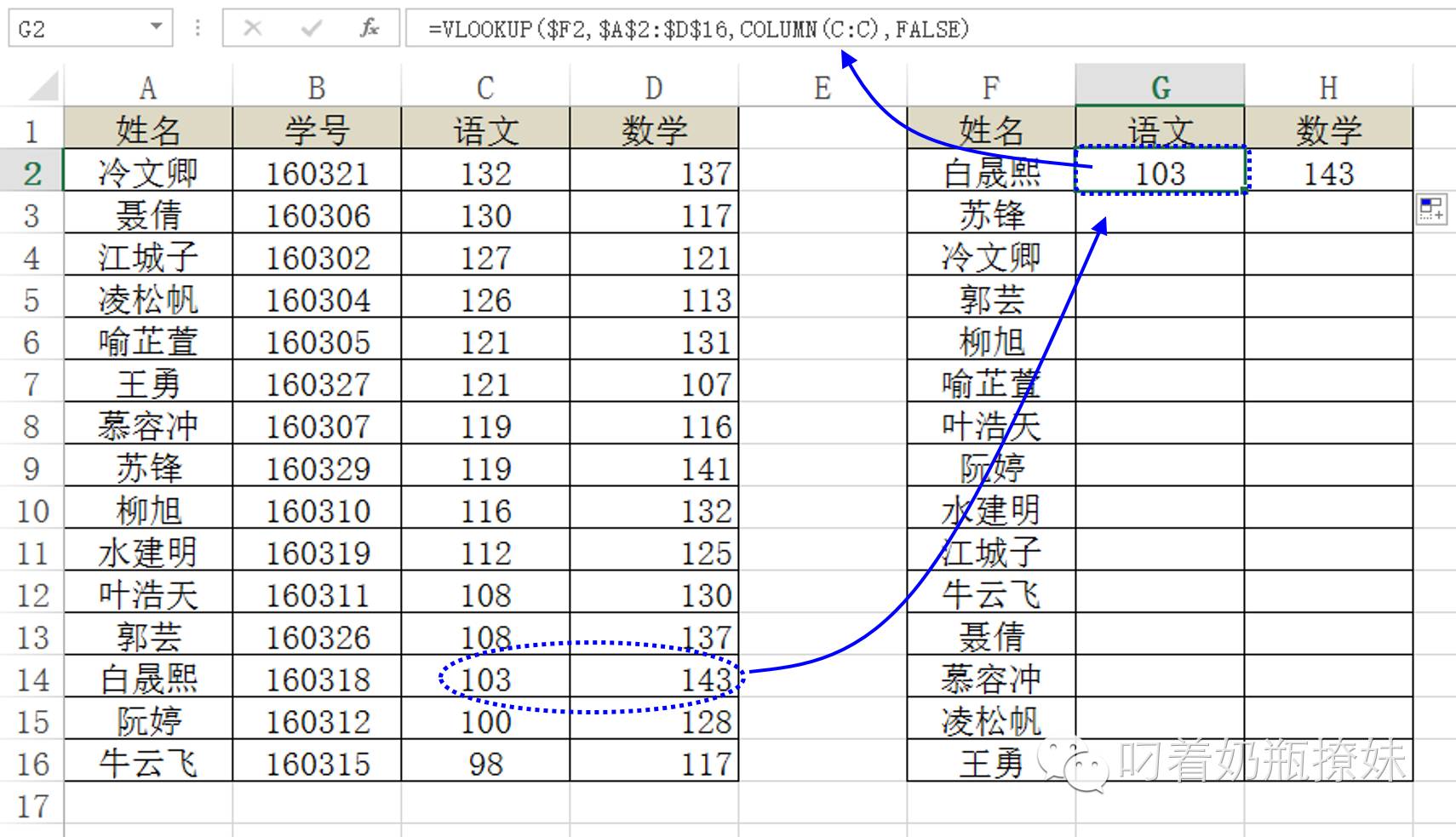 参数2:指定查询的区域,必须包含查找值和返回值,且第1列必须是查找值