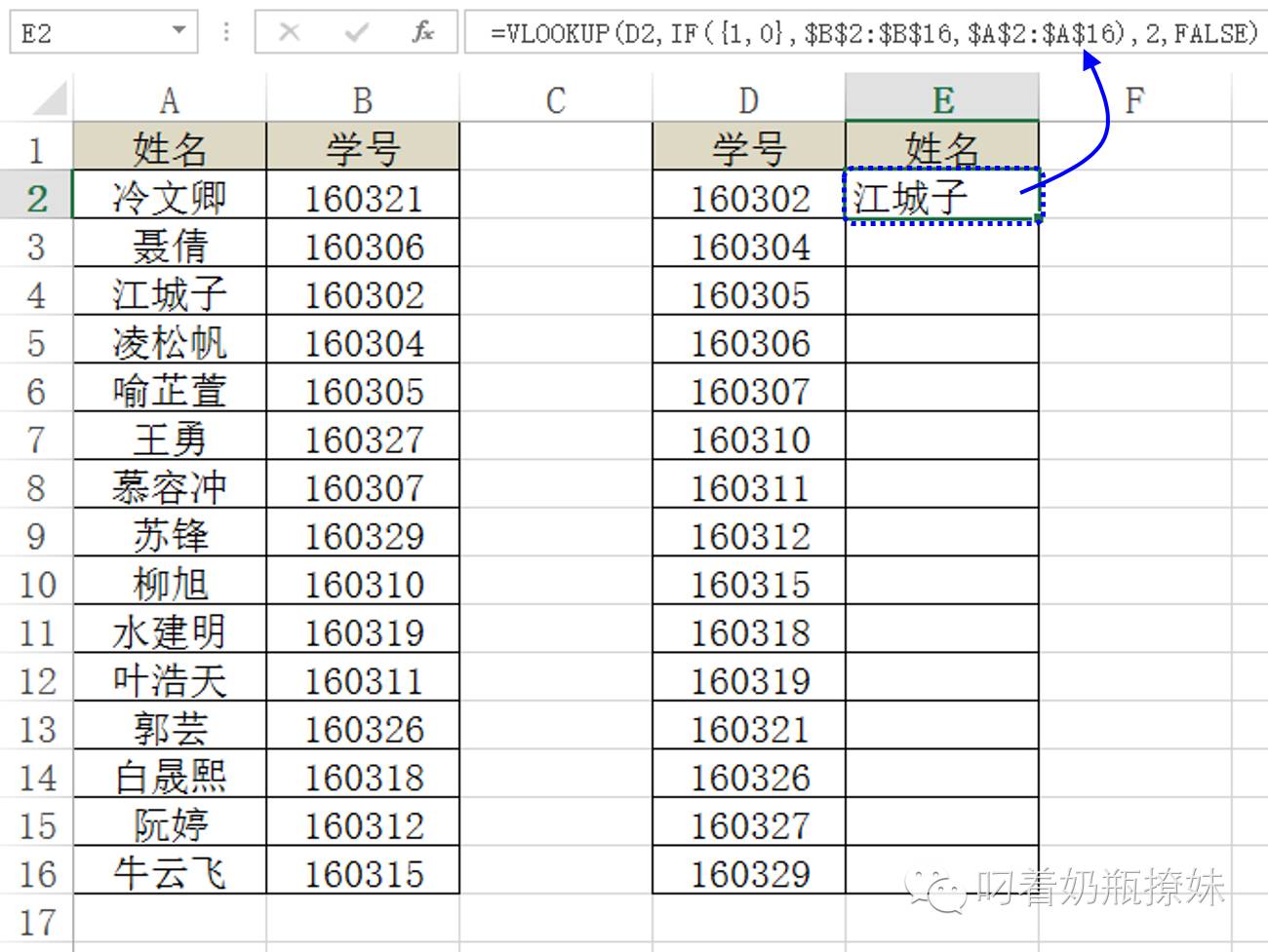 将下图中A列学生的姓名根据相应的学号填充到E列。