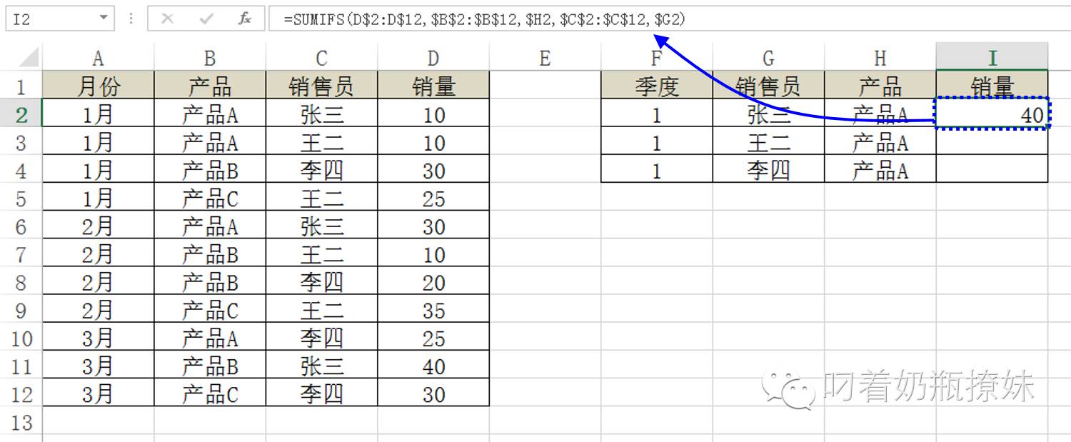 =SUMIFS(D$2:D$12,$B$2:$B$12,$H2,$C$2:$C$12,$G2)
