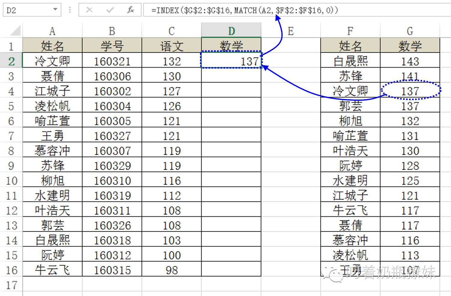 先用MATCH函数在$F$2:$F$16区域查找A2的位置,在使用INDEX引用$G$2:$G$16区域该位置上的数据