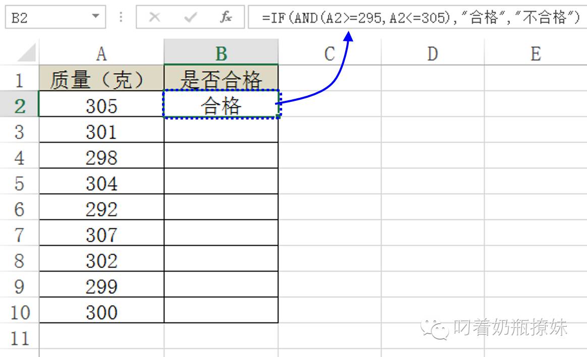 =IF(AND(A2>=295,A2<=305),"合格","不合格")